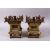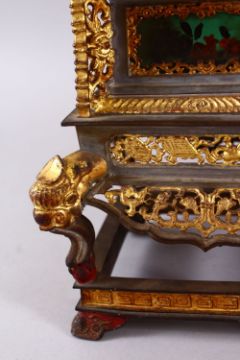 A PAIR OF CHINESE GILT BRONZE & PAINTED GLASS CANDLESTICKS, with gilt bronze openwork decoration, and four panels of reverse painted glass central, with each bearing two character marks underside, 25cm high x 18cm square.