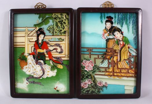A PAIR OF REVERSE PAINTED FRAMED PICTURES, of young ladies, 34cm x 23cm.
