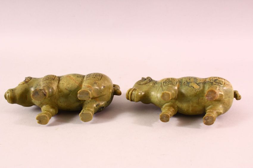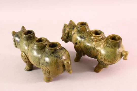 A PAIR OF CHINESE TIBET CARVED SOAPSTONE MYTHICAL BEAST CANDLESTICKS, in the form of beasts,20cm