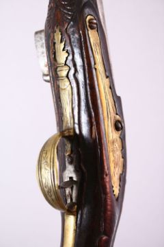 AN 18TH CENTURY ANGLO INDIAN FLINTLOCK PISTOL, engraved barrel, carved stock with wire inlaid decoration and brass buttcap, 49cm long.