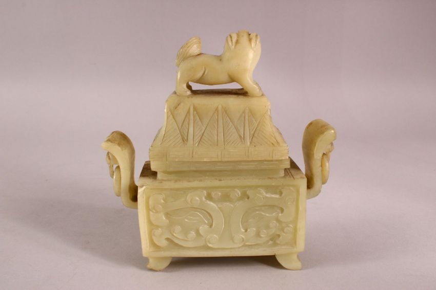 A CHINESE CARVED SOAPSTONE LIDDED CENSER, The body carved with twin handles and stylized bats, the lid with a lion dog finial, 19cm high x 18cm wide.