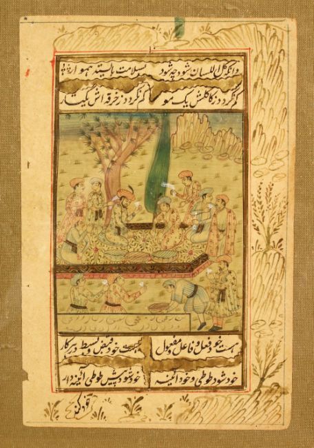 A SMALL FRAMED PERISAN MINIATURE PAINTING ON SCRIPT PAPER, 35cm x 16.5cm