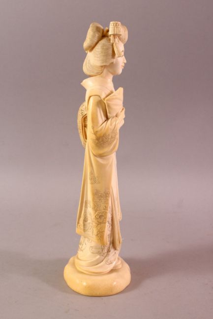 A LARGE AND FINE QUALITY JAPANESE MEIJI PERIOD CARVED ONE PIECE IVORY OKIMONO - BIJIN - the bijin elegantly stood in her gowns holding a small bouquet and pillow, the gowns finely carved depicting native floral chrysanthemum decoration, the okimono stood upon its base with an inset carved red seal tablet underside, from a private UK collector and coupled with its original purchase receipt from an antique shop in leeds. 30.5cm high.