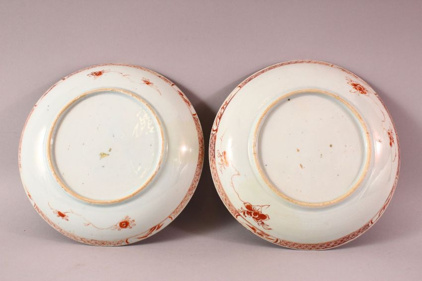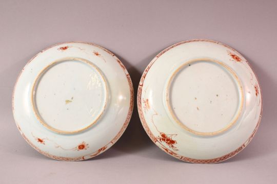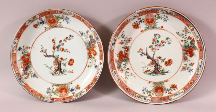 A PAIR OF 19TH CENTURY CHINESE IMARI FAMILLE VERTE / ROSE PORCELAIN PLATES, each decorated similarly, depicting prunus trees and funghi, 22cm & 23cm