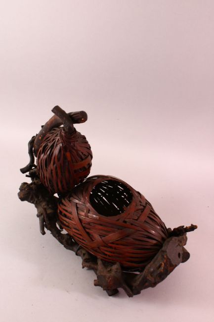 A JAPANESE MEIJI WOVEN DOUBLE GOURD FORMED IKEBANA BASKET, woven in the form of a double gourd, with naturalistic wooden base, 41cm x 38cm