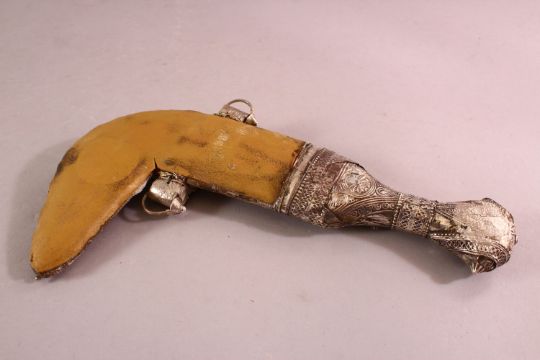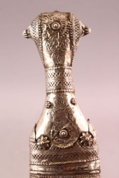 A GOOD SILVER JAMBIYA DAGGER, with embossed foil silver decorations, 25cm