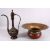 A 19TH / 20TH CENTURY INDIAN / QAJAR EWER & BASIN, the ewer with a carved body of flora, 44cm high , the basin with red and brass decor of formal floral scroll, 39cm diameter.