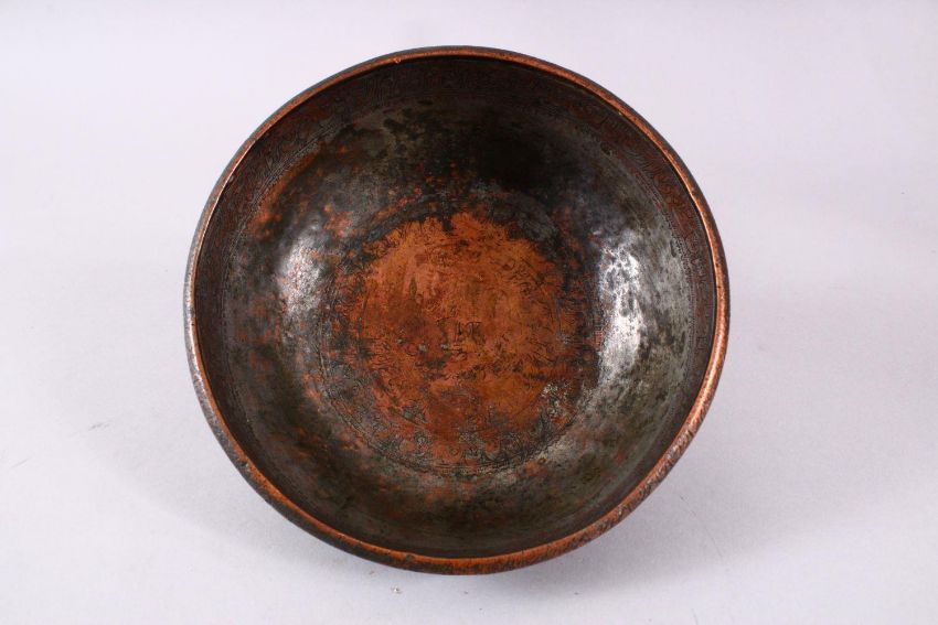 A UNUSUAL ISLAMIC TINNED HAMMERED COPPER CALLIGRAPHIC BOWL, decorated with interior & exterior bands of calligraphy, 17cm diameter.