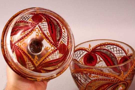A PAIR OF BOHEMIAN RED ENAMELLED GLASS JARS, each with enamel and gilt work, 20cm each