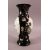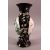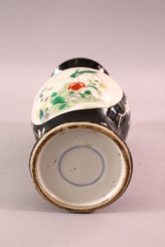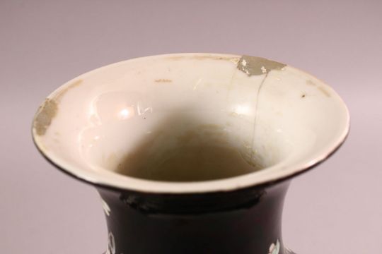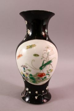 A 19TH CENTURY CHINESE FAMILLE NOIR PORCELAIN VASE, the black ground decorated with panels of figures aside waterside landscapes, with prunus decoration, 25.5cm high.