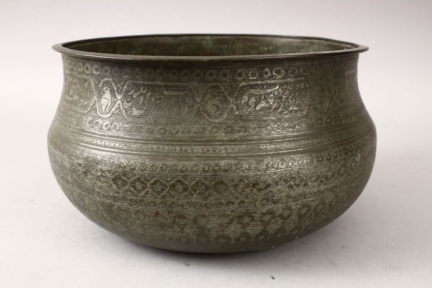 A LATE 19TH CENTURY PERSIAN COPPER CALLIGRAPHIC BOWL , with panel decoration of calligraphy, formal flora and animals, 16cm high x 26.5cm diameter,