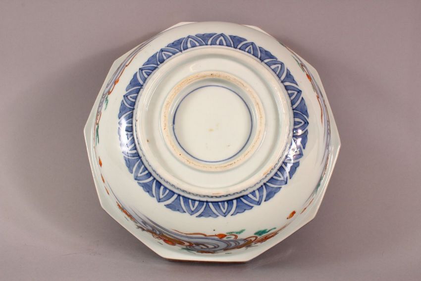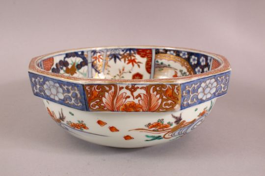 A JAPANESE MEIJI PERIOD IMARI DECAGON SHAPED PORCELAIN BOWL, with underglaze blue Shi shi dog, with typical orange and gilt decoration depicting animals, birds and flora, 25cm