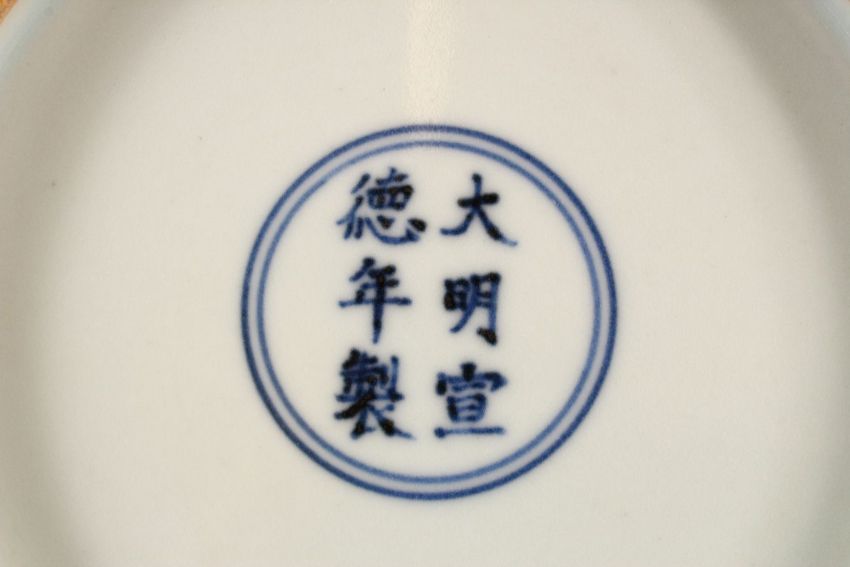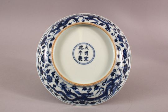 A CHINESE MING STYLE BLUE & WHITE PORCELAIN DRAGON DISH, With dragons and lotus, the base with a six character mark, 22cm