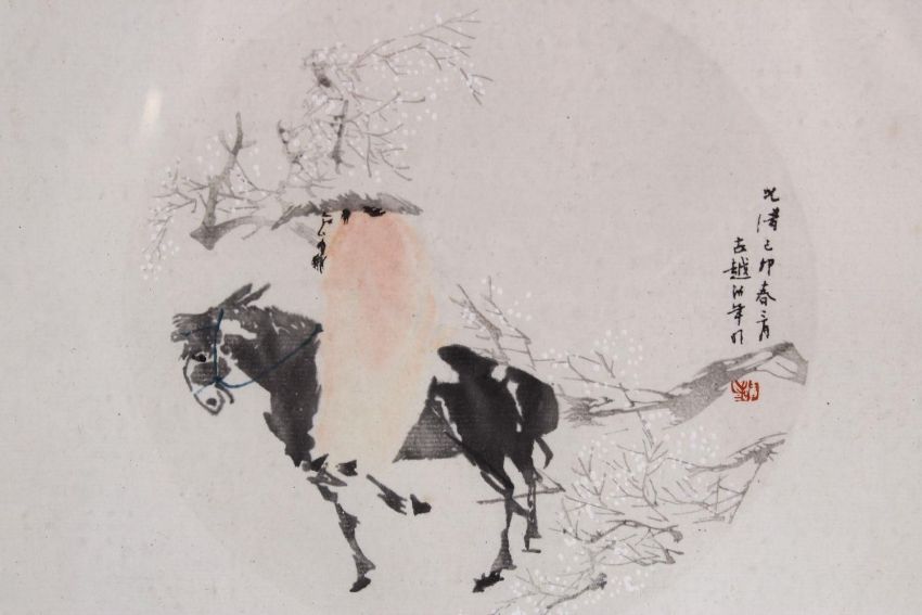 A CHINESE FRAMED PAINTED TRIO, depicting fruit, figure on horseback, and flora, each sealed and signed, 42.5cm x 23cm