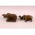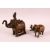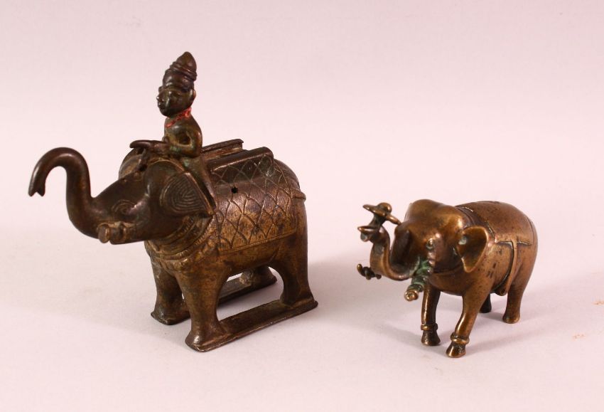 AN 18TH/19TH CENTURY INDIAN BRONZE ELEPHANT AND MAHOUT, together with another bronze elephant, 11cm and 14cm long.