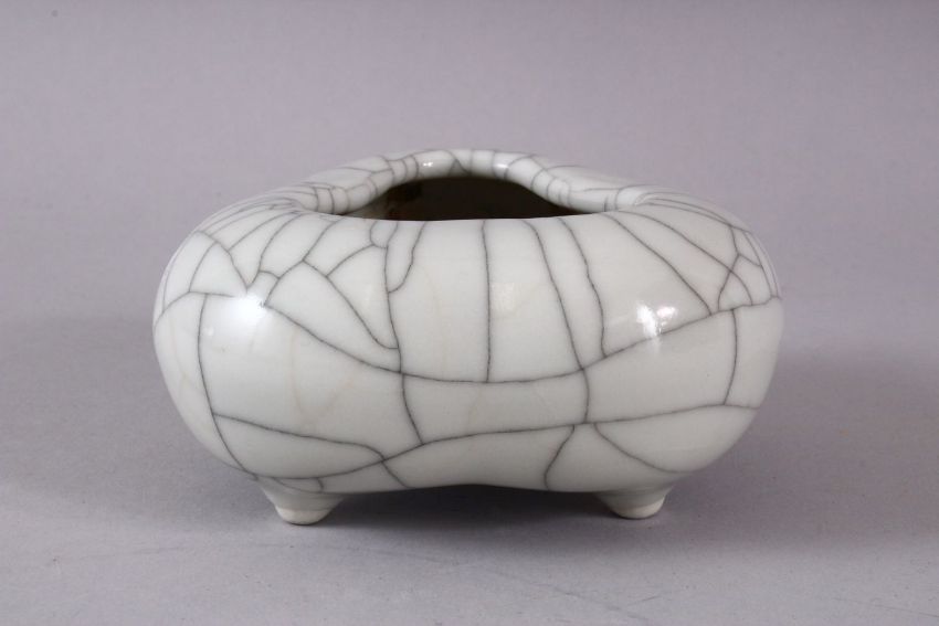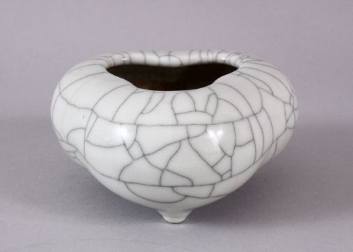 A CHINESE GE GLAZE PORCELAIN TRIPOD BRUSH WASH, with iron wire style decoration, 10cm.