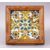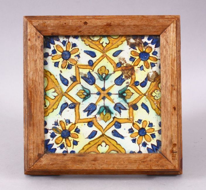 A 19TH / 20TH CENTURY TURKISH POTTERY TILE SECTION, housed within a wooden frame with feet, decorated with floral motifs, 19cm square.