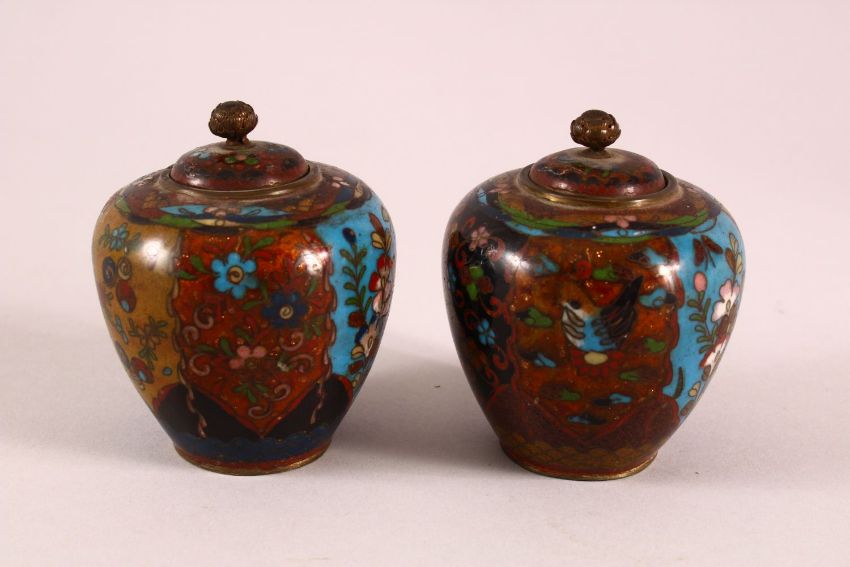 A SMALL PAIR OF CLOISONNE KORO AND COVERS, the bodies decorated insects, flowers and birds, 8cm high.