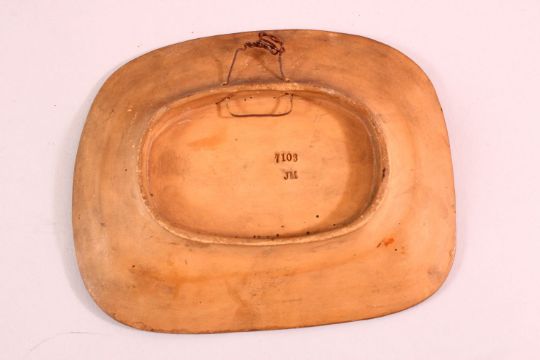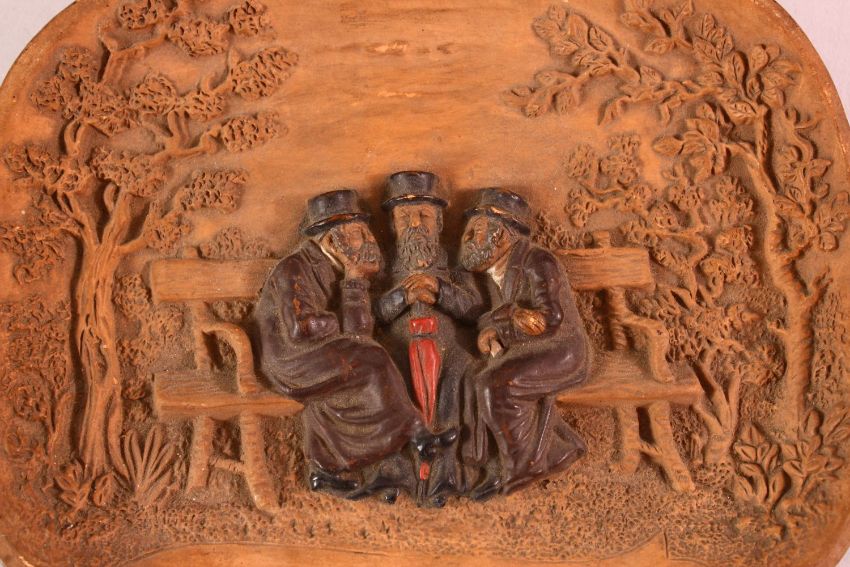 A SMALL JEWISH TERRACOTTA FIGURAL DISH, depicting three seated figures, 17cm x 14cm
