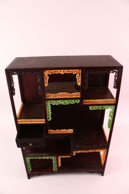 A CHINESE HARDWOOD AND STAINED IVORY MINIATURE CABINET, with carved and stained bone or ivory sections, 40cm wide x 60 cm tall x 15cm deep.