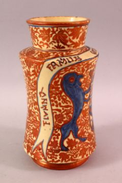 A SPANISH MORESQUE LUSTRE POTTERY MEDICINE JAR, decorated with a copper lustre and lion decoration, 25cm
