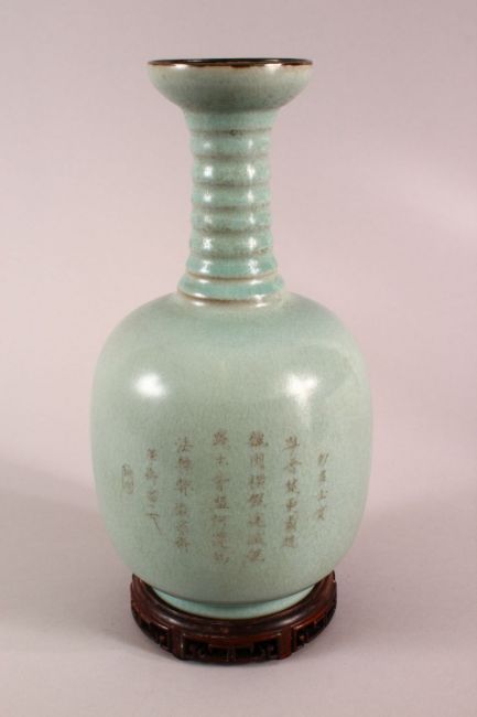 A CHINESE SONG STYLE RU WARE VASE, with incised calligraphy to the body, ribbed neck and carved wooden stand, 26cm high