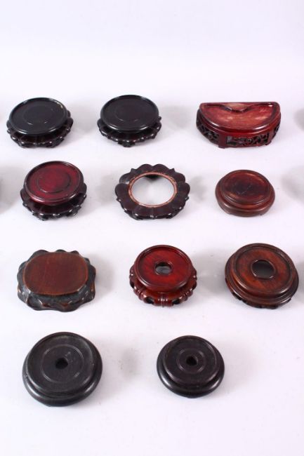A MIXED LOT OF 20 CHINESE CARVED HARDWOOD STANDS - each of varying size, style and timber, the largest housing a vase no greater than 7.5cm, the smallest 5.2cm.