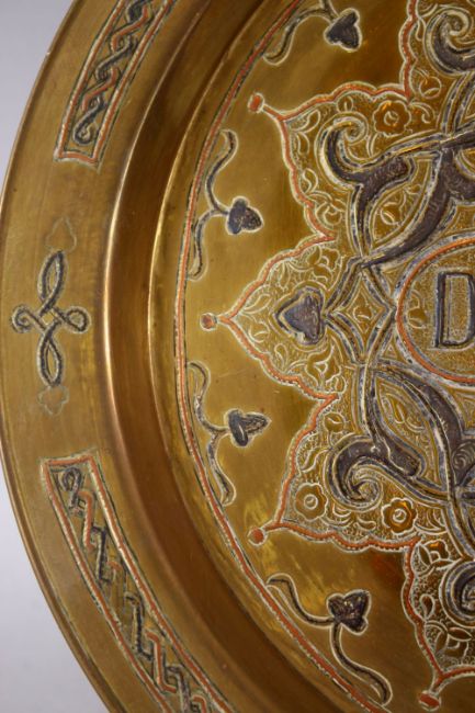 A DAMASCUS SILVER INLAID BRASS CIRCULAR DISH, 31cm diameter.