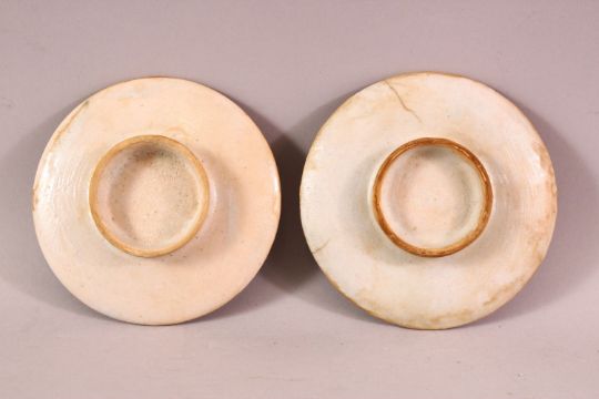 A PAIR OF OTTOMAN KUTAHYA POTTERY PLATES, each decorated with figures, 12cm