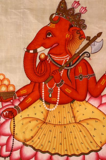 A INDIAN SILK PAINTING OF GANESH / DEITY, 55cm x 45cm