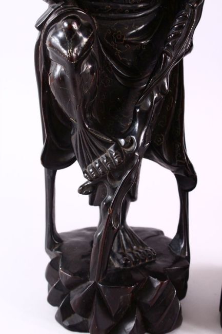 A LARGE PAIR OF 19TH CENTURY CHINESE SILVER COLOUR WIRE INLAID FIGURES OF SAGES, the mirrored pair of figures inlaid with silver coloured metal inlay, depicted holding a bat in his hand, upon a rocky formed base with his staff, 44cm high