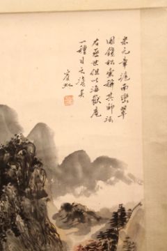 A CHINESE SCROLL INK PAINTING OF A LANDSCAPE, the upper right section with calligraphy, 69cm x 43cm ( picture alone )