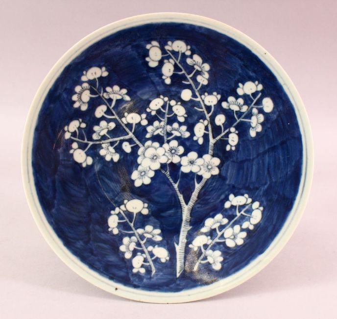 A 19TH CENTURY CHINESE BLUE & WHITE PRUNUS PORCELAIN DISH, the centre with a blue ground and prunus decoration, 27.5cm