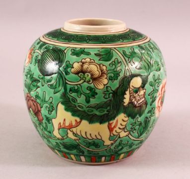 A LATE 19TH CENTURY CHINESE FAMILLE VERTE PORCELAIN JAR, decorated with buddhistic lions and flora, 12cm.