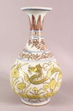 A CHINESE MING STYLE SANCAI DECORATED PORCELAIN VASE, decorated with dragons and lotus, the front with a six character mark. 35cm