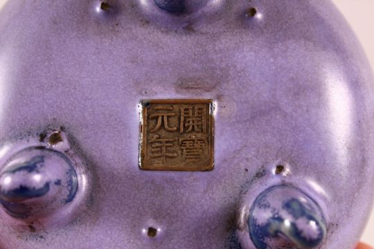 A CHINESE SONG STYLE AUBERGINE GLAZE WINE POT, with tripod feet, the base with a mark, 13cm high.