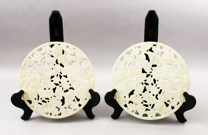 TWO 20TH CENTURY CHINESE CARVED HARDSTONE / JADELIKE BI - DISKS, each disk carved with koi carp and prunus design, with two wooden stands, 26cm diameter (2)