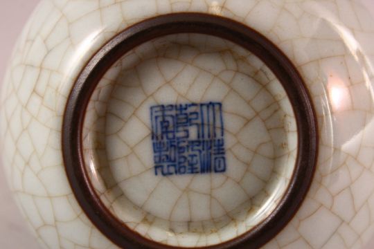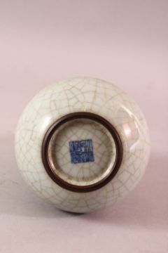 A 19TH / 20TH CENTURY CHINESE CRACKLE GROUND CELADON DOUBLE GOURD PORCELAIN VASE, the base with a six character qianlong mark, 14.5cm high.