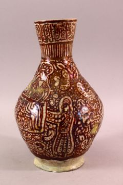 A PERSIAN QAJAR KASHAN POTTERY VASE, the body decorated with figures and motifs, (AF) 26cm