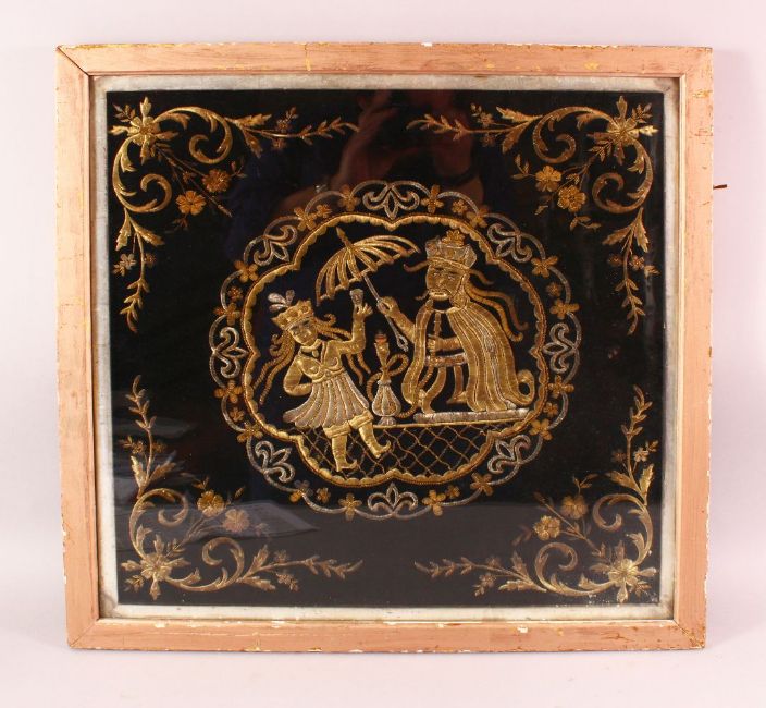 A FINE 19TH CENTURY OTTOMAN TURKISH METAL THREAD EMBROIDERED TEXTILE PICTURE, the central panel depicting two figures, one seated smoking a huqqa, 54cm square.