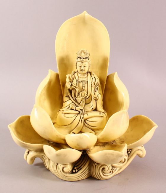 A CHINESE BLANC DE CHINE FIGURE OF GUANYIN & LOTUS, the body with a yellow hue, the verso with a mark, 33cm high x 29cm wide.