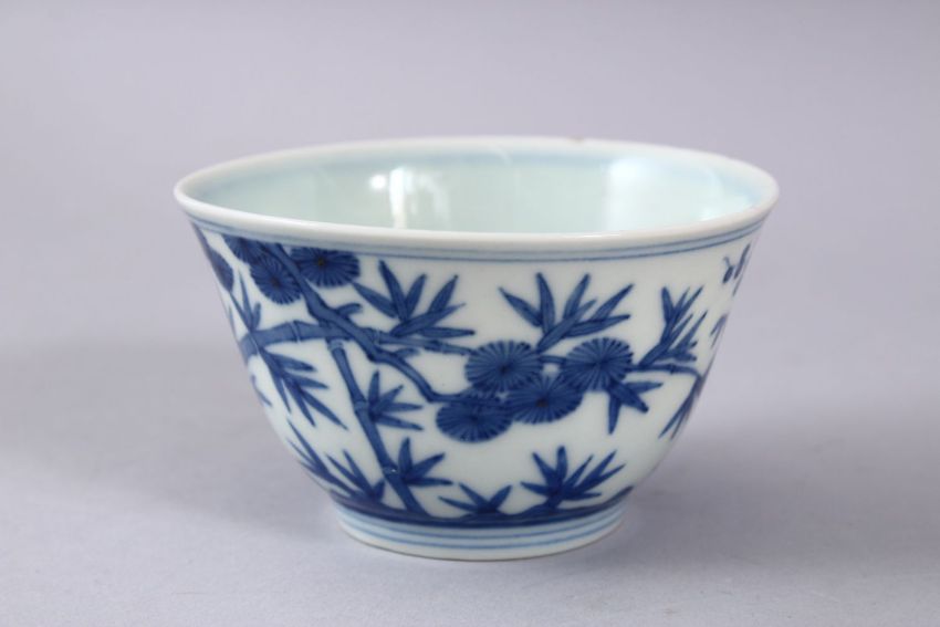 A GOOD CHINIESE BLUE & WHITE MING STYLE PORCELAIN BOWL, decorated with pine trees and bamboo, the base with a six character mark. 9cm.