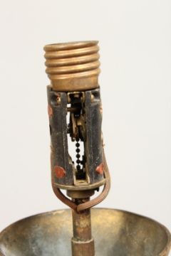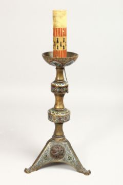 AN EARLY ORIENTAL CHAMPLEVE ENAMEL CANDLESTICK, 12ins high.