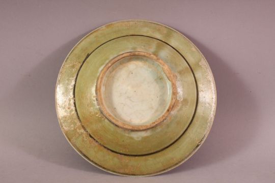 A GREEN GLAZED TIMURID POTTERY DISH, with floral motif decoration, 21cm