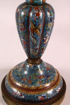 A GOOD 19TH CENTURY JAPANESE CLOISONNE LAMP BASE of baluster form, decorated with phoenix and flowers on a blue ground, 38cm high.