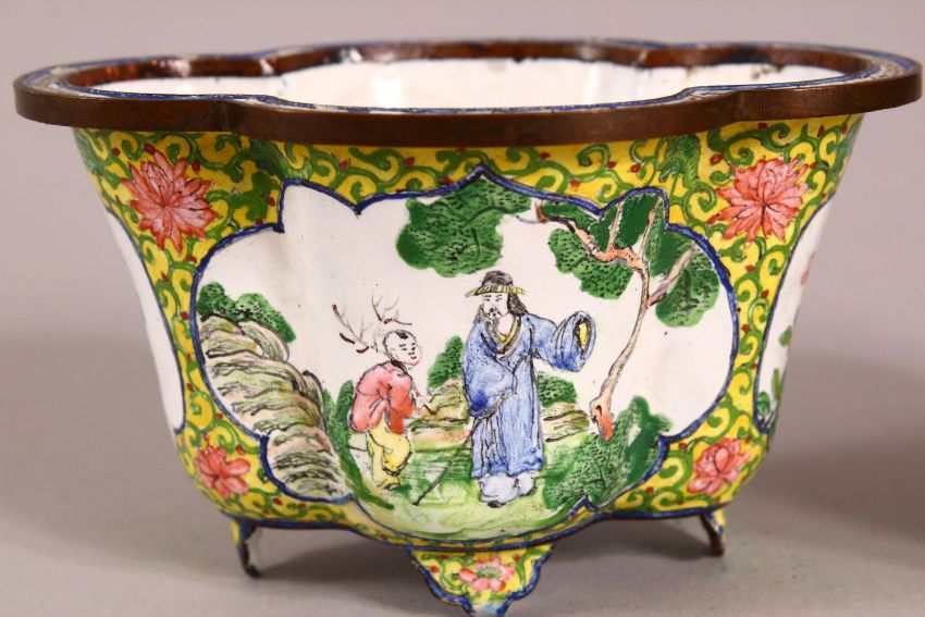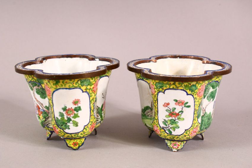A PAIR OF CHINESE QIANLONG ENAMEL BOWLS, each decorated with a yellow ground and panels of figures in landscapes, the bases with four character marks, 10cm wide,