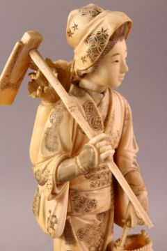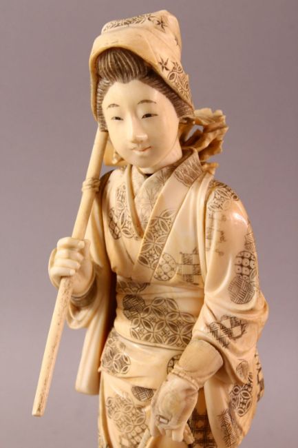 A LARGE JAPANESE MEIJI PERIOD CARVED IVORY OKIMONO - FARMER - the large okimono depicting a female worker gathering her crops, holding a basket and plough, the underside with a carved stained red signature, 29cm.