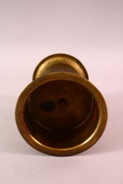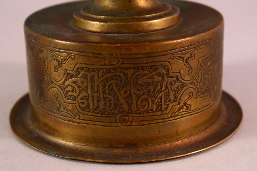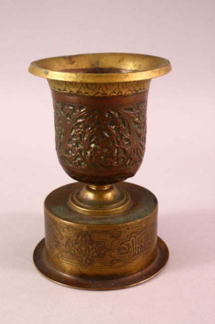 A 19TH CENTURY ISLAMIC BRONZE & COPPER CHALICE, with engraved decoration and a gilded rim, 14cm high.