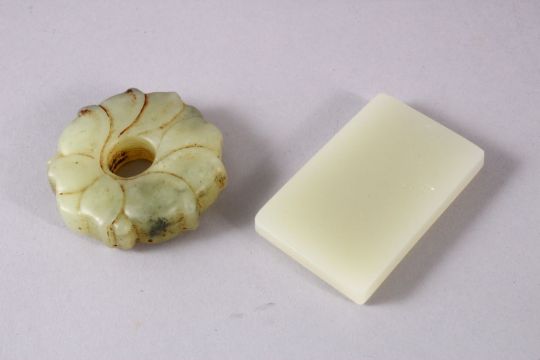 TWO CHINESE CARVED JADE BI & TABLET / PENDANT, one carved in the form of lotus, 5cm, the other of a figure with calligraphy, 6cm x 4cm