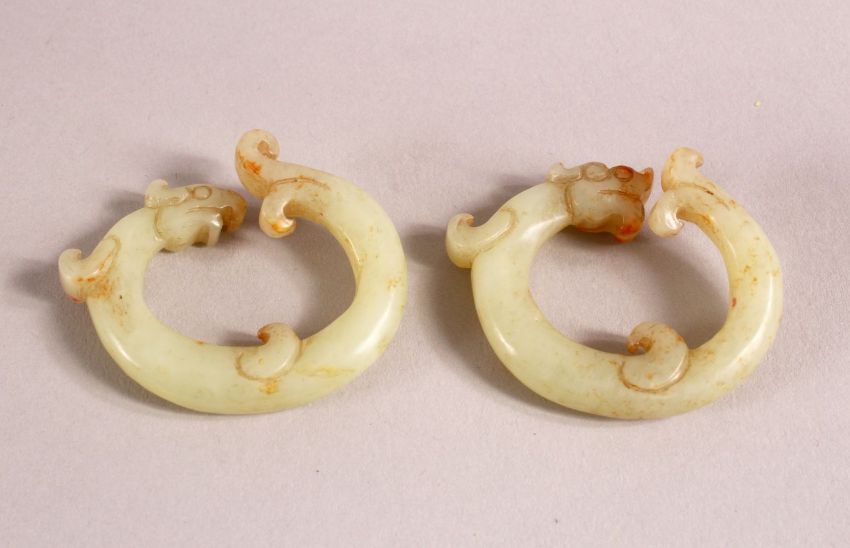 A CHINESE CARVED JADE TWO DRAGON LINK RING, 4cm each.